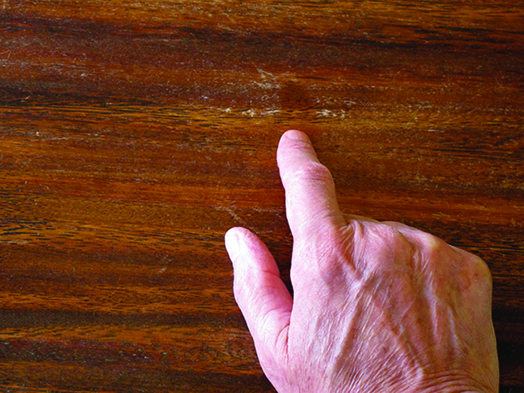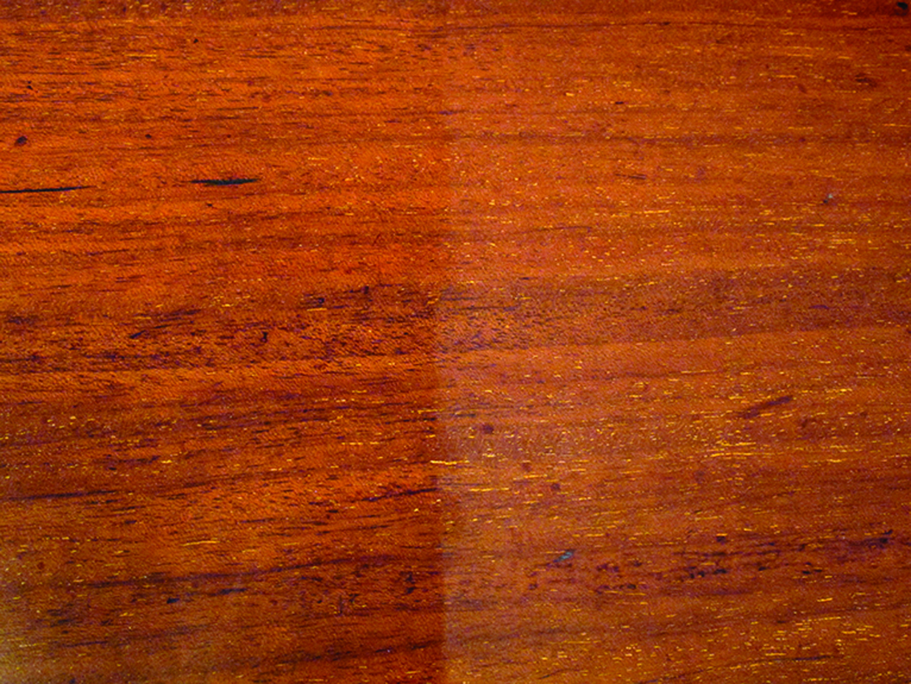 Wet to see depth. To see what a revived finish will look like, wet the surface (left) with mineral spirits or furniture polish. Neither will damage any finish and they flow out better than water.