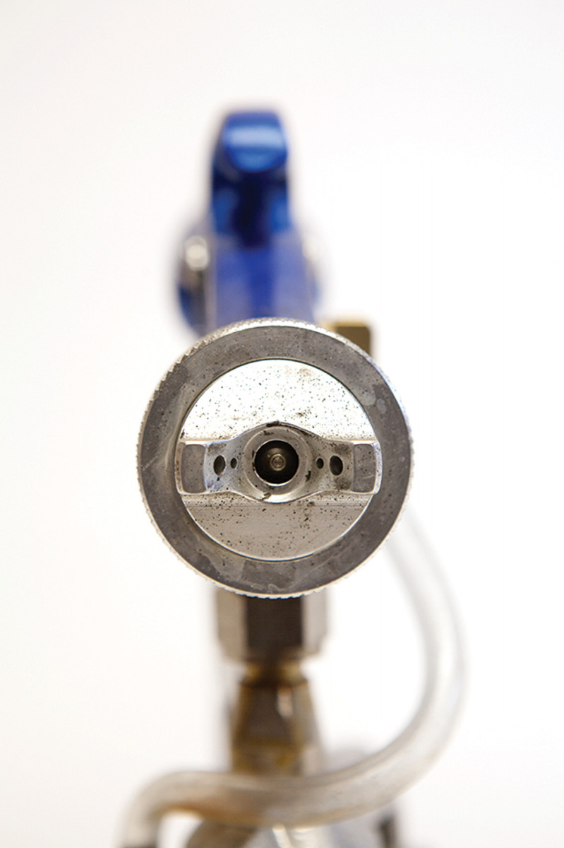The other important adjustment on the gun is the air cap – it controls whether the fan is spraying a horizontal band of finish, a vertical one or something that is roundish.