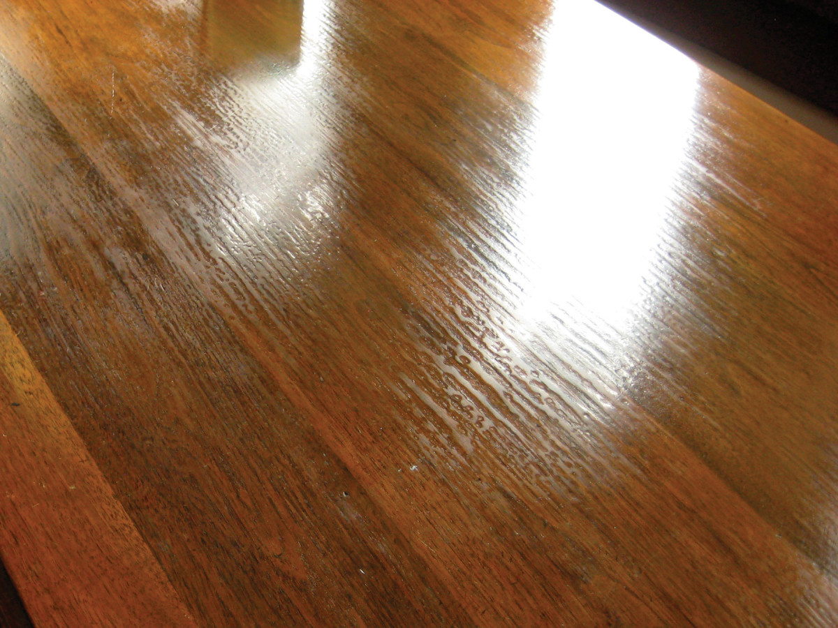 Fish eye. Maybe the biggest problem in refinishing is “fish eye,” where the finish refuses to flow out over a slick surface. This is caused by furniture polishes containing the synthetic oil silicone having been used for dusting; some silicone gets in the wood. In this case, the finish is polyurethane.