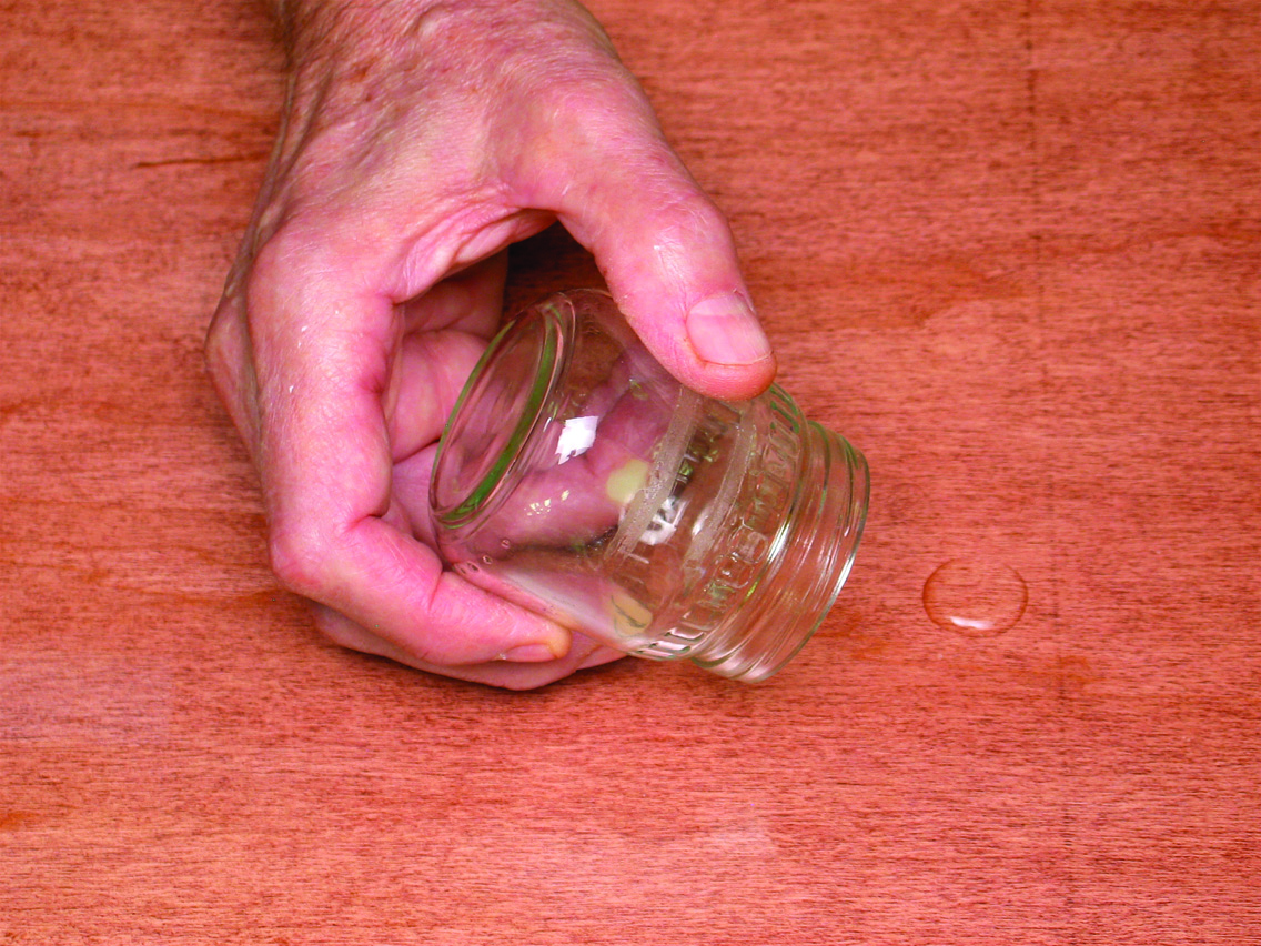 To test for the color of a liquid finish, pour some into a glass jar or onto a glass plate and hold the glass against something white such as a piece of paper. It’s easy to compare finishes when you place the test jars or plates next to each other.