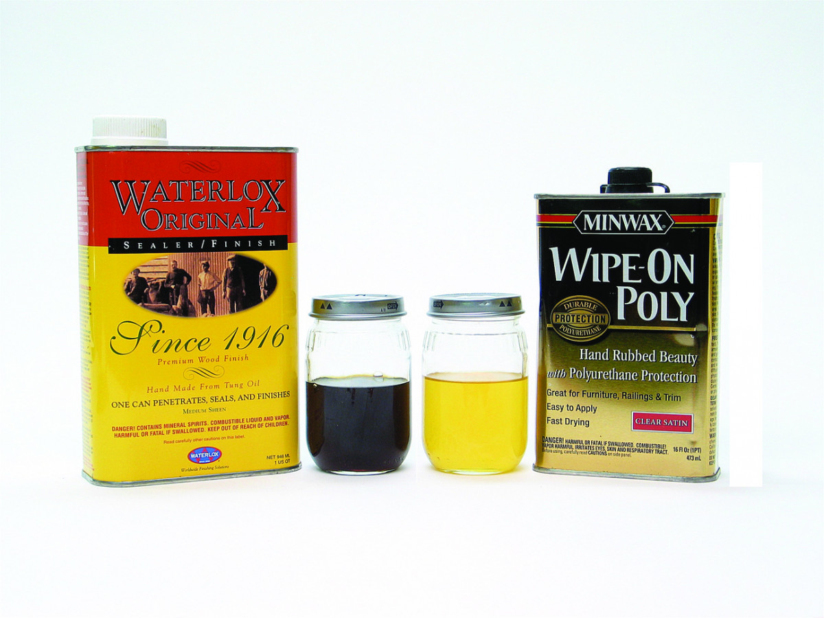 To determine the color of a finish, and thus the relative amount of color change it will add to the wood, pour a little of several finishes into jars and place them next to each other against a white background. Here I’m comparing two wiping varnishes. Waterlox is much darker and will make wood significantly darker than Minwax’s Wipe-On Poly.