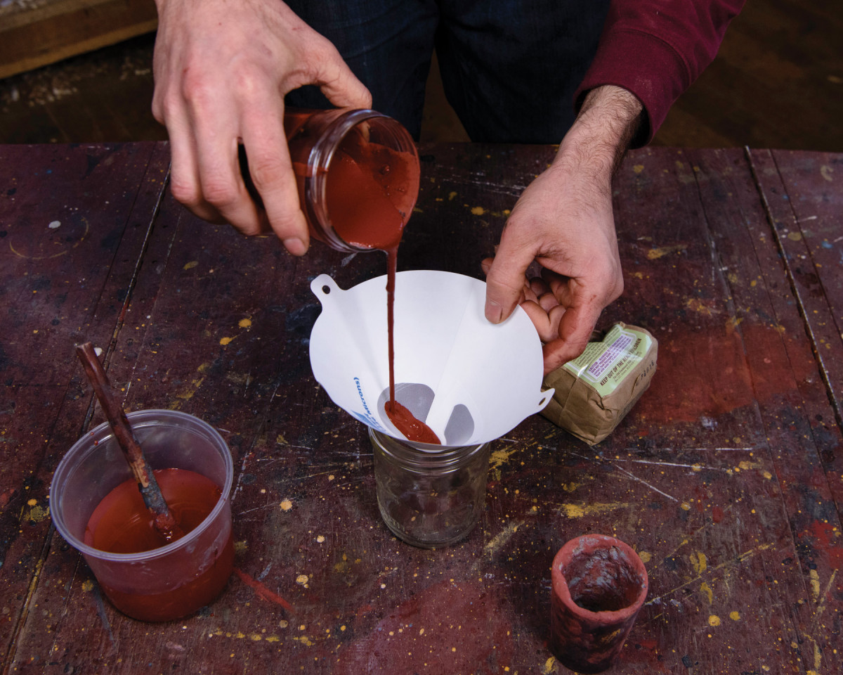 3) Strain it. To remove any solid particles, strain it through an automotive paint strainer into another container. A piece of paint-strainer bag from the hardware store also works well. Thin it as necessary, aiming for the consistency of thin cream (measuring roughly nine to 11 seconds with a #4 Ford viscosity cup). Add water slowly; small quantities of water can profoundly change the viscosity.