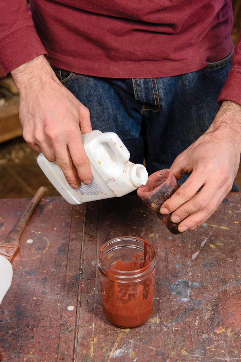 4) Some adhesion necessary. When painting dense woods or woods with pitch (pine, maple, etc.) stir adhesion additive into the first coat to prevent the paint from peeling. The additive is sold by milk paint manufacturers; mix according to the instructions. It changes the look of the paint, so use it only in the first coat.