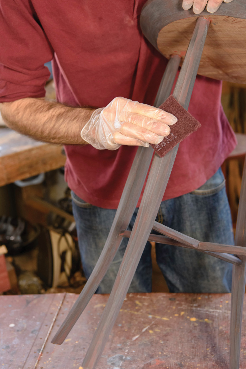 15) Smooth it out. In its natural state, milk paint looks like chalk and feels like sandpaper. It needs to be burnished (but wait a day or so for the paint to completely dry). Use a maroon Scotch-Brite pad to rub it down. You might rub through the paint on sharp corners, but this is a side effect (if a somewhat pleasant one), not the goal.