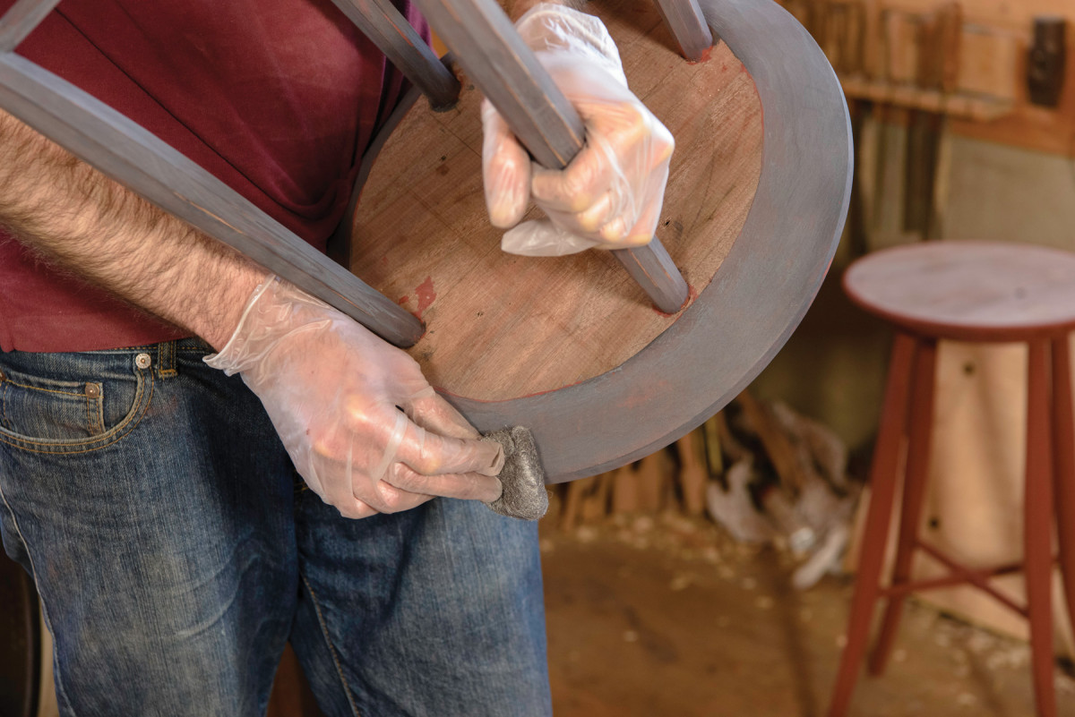 16) Steel wool. Some paint brands (such as Old Fashioned Milk Paint) will burnish to a fairly high sheen. Test your paint to see if #000 steel wool has any effect. With steel wool, pressure is what causes the sheen, so push on the wool as hard as you can. This will add luster and visual depth to the finish. Wear marks, however, are not my objective; I find that objects wear fast enough without accelerating the process.