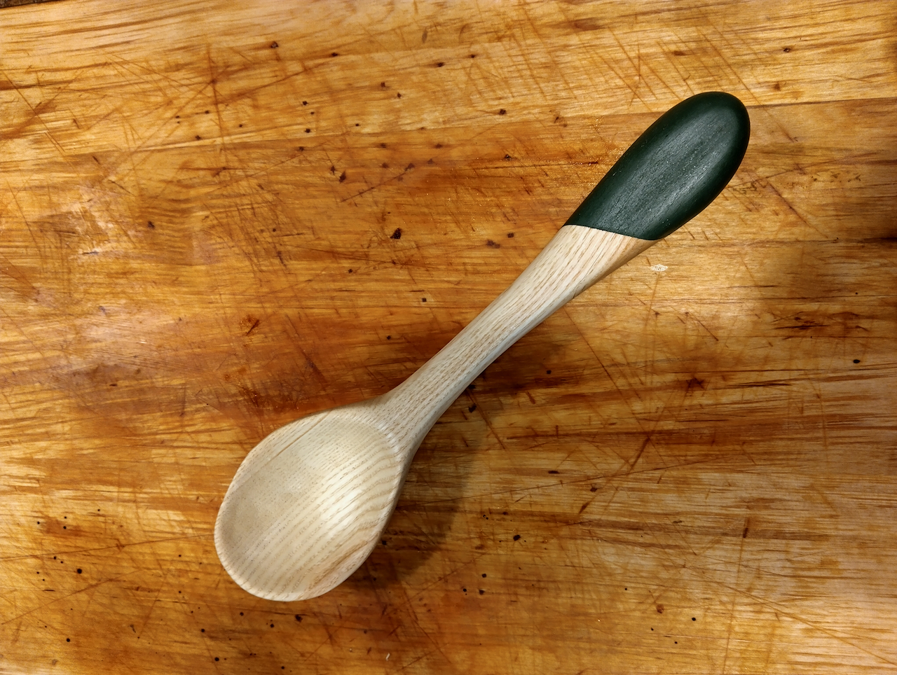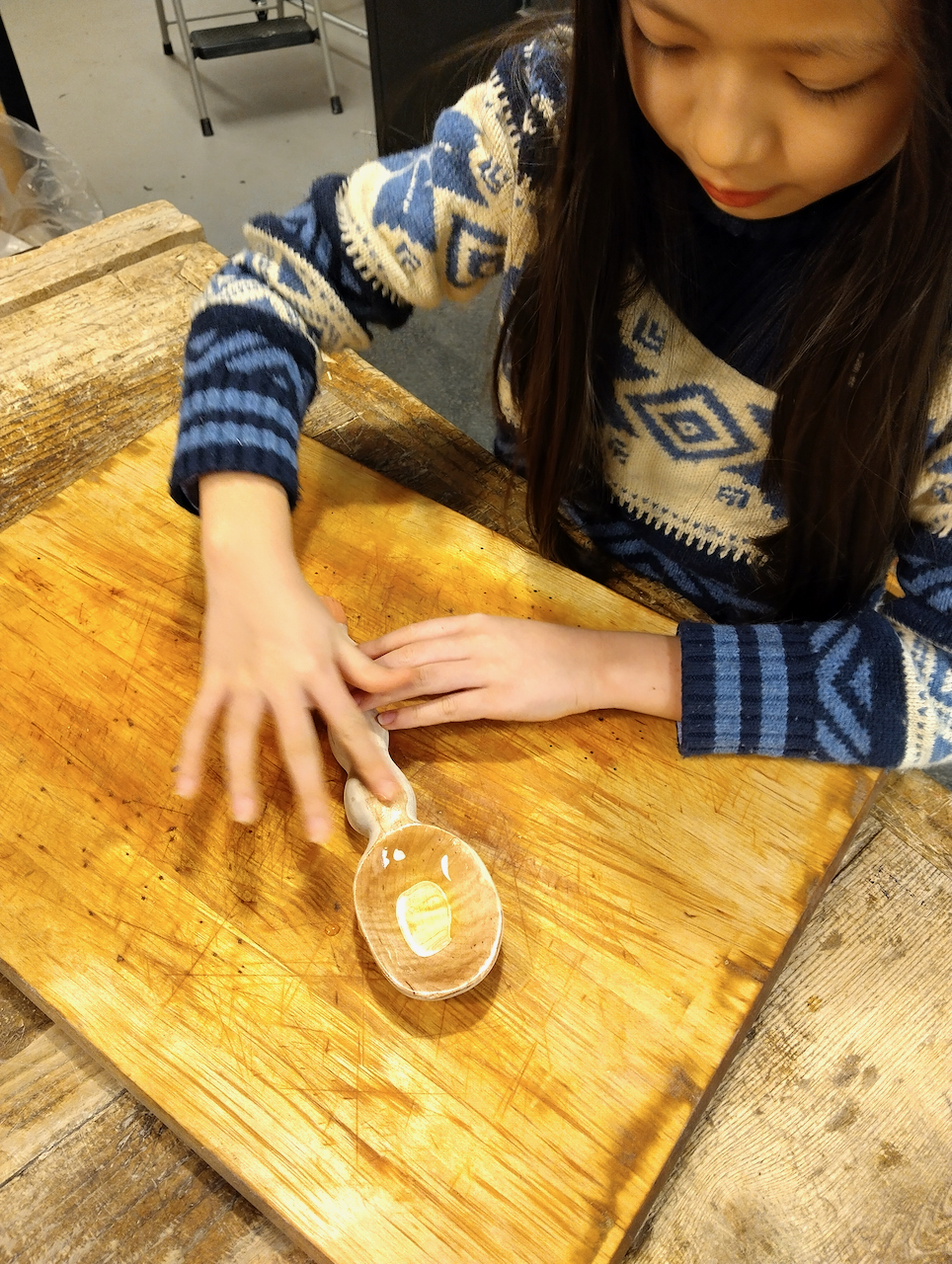 A new spoon is anointed in the 5th-grade class. Notice the milk paint color accent at the tip of the handle. I will talk about milk paint later during this series of entries.