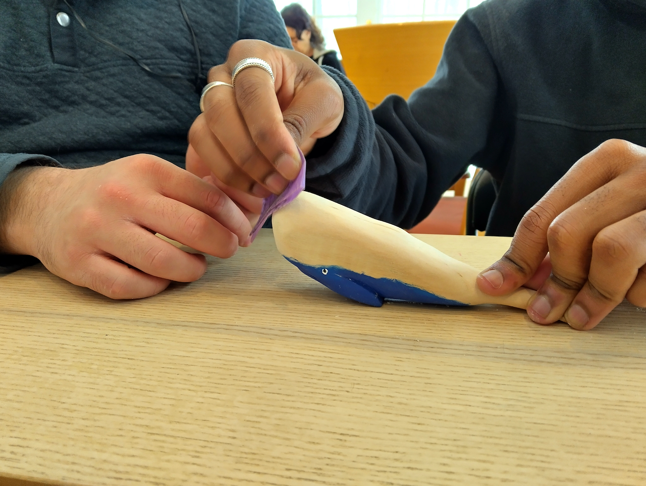 One of my students at Endeavor 21 (a program geared to help adults with learning disabilities and autism), assisted by his helper/mentor, applied a coat of flaxseed oil on the whale they just finished carving.