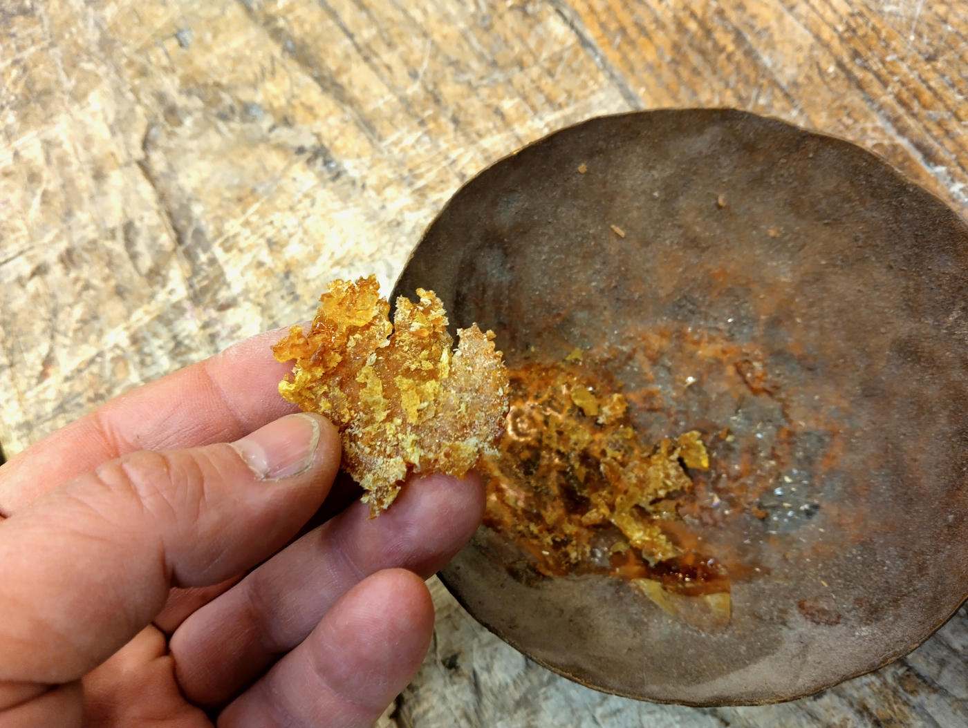 This used to be our flaxseed bowl into which I poured the oil that was used to finish our projects. Over time, the leftover polymerized (absorbed oxygen from the air and solidified). As you can see, the cured oil has the texture and hardness of hard cheese rather than the plastic feel of a hardened polyurethane or oil-varnish mixture. But once the finish percolates into the wood fibers and cures, the wood-finish matrix is quite resilient.
