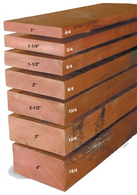 Rough lumber thicknesses are measured in 1/4-in. increments. The thinnest rough-cut boards, labeled 4/4, and called four quarter, are 1-in. thick. It’s tough to get surfaced stock thicker than 13/16-in. from 1-in. rough stock.