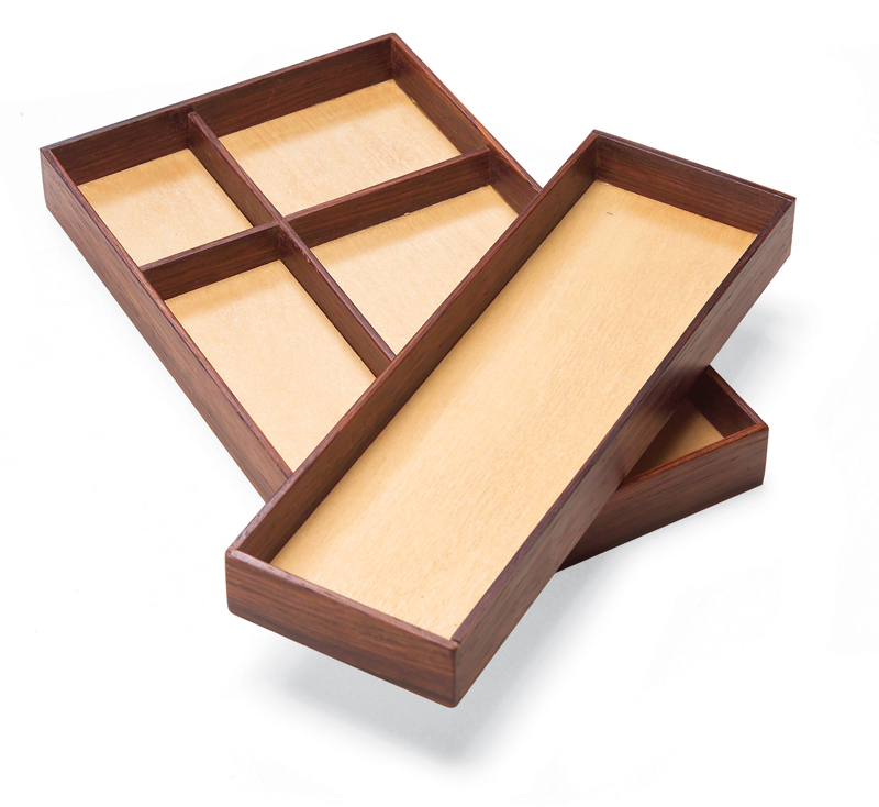 For the interior trays, you’ll need a little 1/4-in. plywood and some 1/8-in.-thick solid wood that looks elegant, such as rosewood. I chose cocobolo.