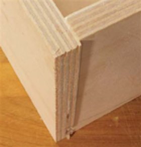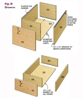 Start with the DrawersBegin with the drawers, because they have to be a precise width to hold the hanging files properly.You can then work outward from the drawers,making the cabinets fit the drawers perfectly. 1. Rip two sheets of Baltic birch plywood as shown in Fig. K, below. Crosscut the drawer parts (D1 through D5) from these pieces. Save the scrap pieces for testing your joinery setup later. 2. Cut the groove in the drawer sides (D2 and D5).We used the groove cutter from the adjustable tongue-and-groove set, in a router table.Use a featherboard and make test cuts to fine-tune the setup. Cut grooves in all the drawer parts, and don’t move the router table fence when you’re done. 3. Make a support/layout board for cutting the biscuit slots (Photo 1). Cut biscuit slots in the drawer sides first, then in the drawer fronts and backs.Use the support/layout board to lay out biscuit locations. 4. Measure the width of the drawer bottoms (D3).Dry-assemble one drawer and measure from the inside of one groove to the inside of the other.Subtract 1/16 in. for clearance (Photo 2). Trim the drawer bottoms to size if necessary. 5. Cut rabbets in the drawer bottoms, using the slot cutter in the router table. If the fence is in the same position, the width of the rabbet will be correct.Adjust the height of the cutter to produce the correct rabbet thickness. Dry-fit the drawers to test. 6. Assemble the drawers. First, sand all the drawer interiors.Then assemble the drawers (Photo 3),using #0 biscuits and white glue (for extra working time). Check drawers for square by measuring from corner to corner.