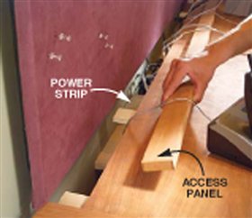 Manage Those *$%# Cords!A loose panel at the back hides all the mess. It gives access to power strips on narrow shelves behind the desk, making it easy to connect and disconnect equipment.