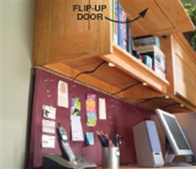 Store Paper Supplies…and reference materials behind flip-up doors. Cords for the under-cabinet lighting are concealed behind the bulletin board. |