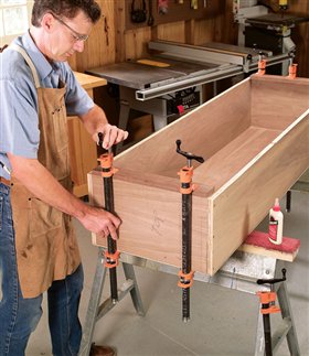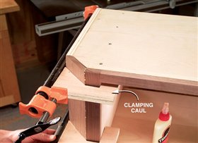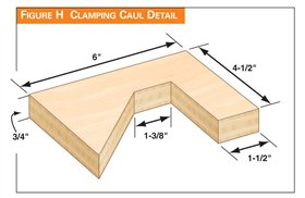 2. Gluing the angled corners can be tricky, but it’s easy with a pair of plywood cauls. They hook around the front stile to prevent slipping and apply pressure to the corner’s face.