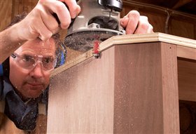 3. Trim the base top of the drawer unit even with the case. A perfect fit is important, and it’s much easier to achieve with a flush-trim router bit than by measuring and sawing.