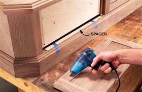 4. Temporarily attach the drawer front with a few dabs of hot-melt glue. Open the drawer and drive in the screws that will permanently hold the front. When you’re ready for finishing, remove the front and scrape off the hot glue.