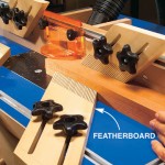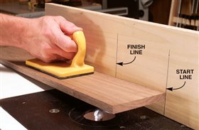 6. Flute the corner boards for the bookcases with a core box bit on your router table, tipping the board onto the router bit at the beginning and up at the end. Start and stop marks on the router fence provide the starting and stopping points of the flute.