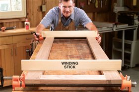 8. Assemble the doors. Check that they are flat by sighting down a pair of winding sticks. Add shims, if needed, under the clamps until the top edges of the winding sticks align with each other. After the doors are out of the clamps, to avoid warping, make sure to store them flat until you install them.
