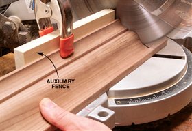 9. Cut the crown molding. Nesting the molding against the table and a tall auxiliary fence simplifies mitering, because it doesn’t require a compound miter setup.
