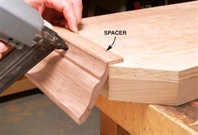 10. Attach the crown molding to the mounting board with a brad nailer. Use a spacer to create a lip on the bottom side. This lip will overhang the top edge of the bookcase units and hide the joint.
