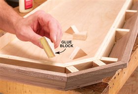 11. Add triangular glue blocks behind the crown molding for added strength. This crown assembly is screwed to the top of the bookcase.