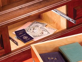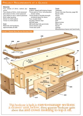 | Sometimes a new piece of furniture conjures up images from a distant time and place. This bookcase, I imagine, would fit right into an early 20th-century lawyer’s office, filled with leather-bound volumes and smelling of cigars. Rich walnut and generous moldings give it a luxurious feel, and hidden compartments are perfect for top-secret documents. The glass doors are as practical today for keeping dust off your books as they were 100 years ago. I’ve designed this bookcase for a thoroughly modern cabinetmaker, however. Its plywood cases are built with biscuits, the drawers use full-extension ball-bearing slides and the lipped doors are hung with easy-to-install wrap-around hinges. To make this large project more manageable, I built it in sections: a drawer unit below, three separate bookcase units above and a crown molding unit on top. The modular design also makes it easy to move it around your shop and into your house.A big project like this does require a bit of experience. You’ll need to know how to use a biscuit joiner, be well-versed in using a router and router table and know how to install drawer slides. The only advanced technique you may need to know is how to make and install the custom crown molding. If you make the bookcase in oak or birch, you could buy commercial crown molding, but if you choose walnut or cherry, you’ll probably want to make the molding yourself. One approach is covered in “Crown Molding on the Tablesaw” article. |