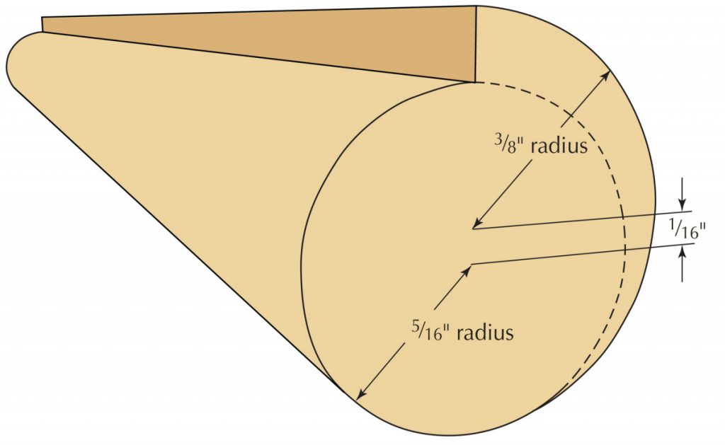 The resulting circle will blend in with the circumference of the stock between 3 o’clock and 6 o’clock. The original patent drawing illustrates this fairly well. Carefully pare away the bulk of the material outside of the smaller circle between 6 o’clock and 12 o’clock with a chisel. Use a shoulder plane and 3⁄8” hollow to fair the curve down to the circular lines on the ends.