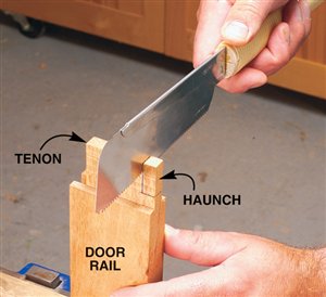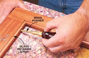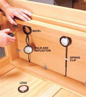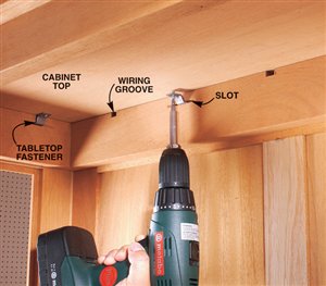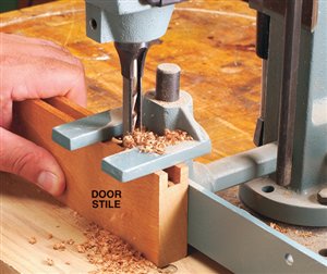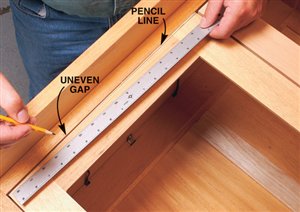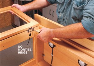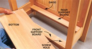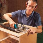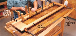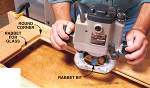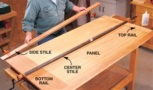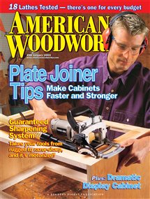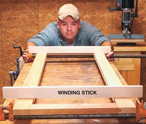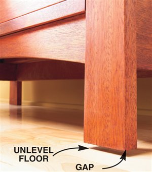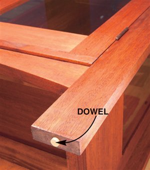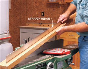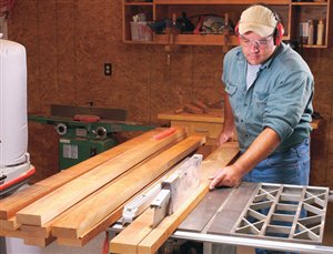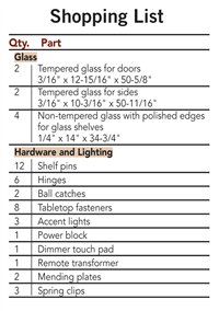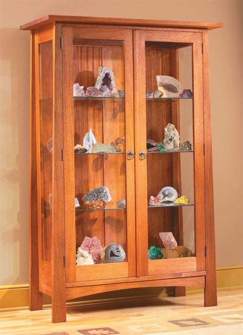 Click any image to view a larger version. 1. Rough cut the stiles for the sides, back, doors and legs. Make a couple extra pieces of each part in case a couple end up warping badly. 2. Let your rough-sawn lumber rest for at least 48 hours. Spread out the parts so air can freely circulate around them. Most wood has a tendency to warp or twist a little after it is rough sawn. Letting your rough parts rest allows them to stabilize before you do the final dimensioning. 3. Joint and plane the parts. Let these parts rest for a few days as well. Then use a straightedge to check for flatness. Pick the straightest and flattest boards for the doors. 4. Use a tongue-and-groove joint for the side and back frames. The groove is quick to make on your router table, and the tongue can be cut with a dado head on your tablesaw. 5. Assemble the side panels on a flat bench. Check for twist by sighting down a pair of winding sticks, which are simply a matching pair of straight boards. Adjust the frame in the clamps until the sticks are parallel. 6. Glue the tapered legs to the assembled side frames. The legs should be flush with the inside of the side frames. Sand the panel side of the legs and the outside of the side frames before gluing these parts together. If you get any glue squeeze out at these inside corners make sure to clean it up with a damp rag before it dries. 7. Rout a rabbet around the inside of the side panels for the glass. The router leaves rounded corners, so cut them square with a chisel. 8. The tongue-and-groove joints at the corners of the box frames provide positive alignment for clamping. 9. Glue and clamp the box frames. Make sure they are perfectly square and flat, because they determine how square and straight the cabinet ends up. 10. Practice clamping the box frames to the side frames. The box frames add an amazing about of strength and rigidity to the cabinet. Once you’re sure the parts fit square and true, add glue and leave everything clamped until completely dry. 11. Assemble the frame-and-panel back. First clamp the center stile and top and bottom rails. Then add the panels and the side stiles. Take a dry run at this assembly before actually gluing it. 12. Screw the back to the top and bottom box frames. Add a mending plate along the side to hold the back to the side leg. 13. Slide the bottom in place. The bottom is screwed at the front through the front support board and held at the rear by a dado in the back panel. The dado is 1/8-in.-extra deep to allow the bottom to freely shrink and expand. 14. Drill the holes for shelf pins. Using a shop-made template and a self-centering drill bit makes this simple and accurate. Align the template with the inside edge of the side stiles. 15. Attach the solid-wood top with tabletop fasteners. This allows the top to expand and contract without cracking. The slots can easily be cut with a plate joiner. Note that wiring grooves have already been routed in the top of the box frame and back. 16. Install the low-voltage lights. This style of light is typically made up of a bezel, a bulb and reflector, and the lens. The transformer and switch are then attached to the back of the cabinet. 17. Drill mortises in the door stiles. Center the mortise bit right in the middle of the groove. 18. Saw the haunch on the door rail tenons. The haunch will fit into the groove in the door stile and stiffens the mortise-and-tenon joint. 19. Attach the doors with no-mortise hinges. Put the door in its closed position and mark for the location of the hinges. The doors will likely fit snug at the top and bottom, and that’s okay for now. Open the door and install the no-mortise hinges. Because you don’t have to fuss with making mortises, their nickname is “the frustration-free hinge.” 20. Check the clearance gap along the top and bottom of the doors. Use a ruler as a guide and draw a pencil line for an even gap. Then remove the doors and belt sand to the pencil line. 21. Install the glass and retainer strips after you have stained and finished all of the cabinet parts. Predrill small holes in the retainer strip and then use a brad pusher to install the small brads. The brad pusher is a lot safer than a hammer around glass. Oops!One of the legs of our cabinet wasn’t touching the floor. Either the floor has a low spot or our cabinet was a little out of square. Not to worry. There’s an easy fix, and it works on almost any piece of furniture that has a similar problem. Just drill a hole in the bottom of the leg and add a piece of dowel long enough to keep the cabinet from rocking. |