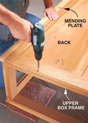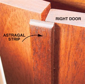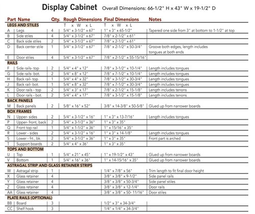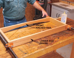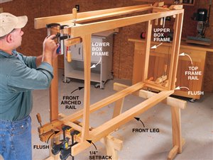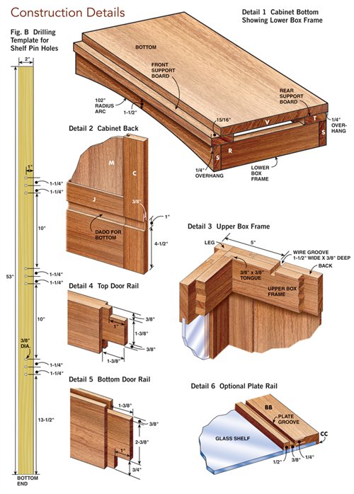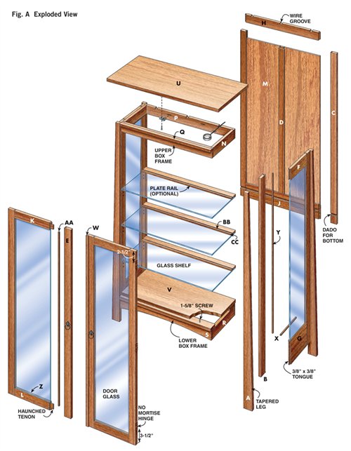 The upper and lower box frames are the secret behind this cabinet’s Tools and materialsThe power tools you need to build this display cabinet include a tablesaw, jointer, planer, bandsaw (or jigsaw), and a router table and router. A mortising machine is helpful but you can also use a drill and chisel to make the mortises. Other necessary tools include an electric drill, a plate joiner, a dado blade and a variety of router and drill bits. Plan on using about 80 bd. ft. of 5/4 (1-1/4-in. thick) lumber for this project. If you use mahogany, the lumber will cost you about $400. Other hardwoods like rift-sawn oak, walnut, or ash would also work. Wood with straight grain works the best. Wavy-grained woods are more likely to bow or twist after construction which could cause problems with the tall doors and panels. The glass and lighting add another $400 to the cost (see Sources, below). That adds up to a big chunk of time and money, but this cabinet is built to last and will be proudly passed on to your children’s children. Mill rough lumber in stagesStart by rough sawing your lumber into parts (Photo 1). See the Cutting List on page 89 for the rough cutting dimensions. Most lumber will twist or warp a bit after it’s rough cut, so let the rough-sawn parts rest for at least a couple of days before jointing and planing them (Photo 2). It’s also a good idea to make a couple extra stiles and legs (A through E) just in case some twist badly. Joint and plane all of the stiles oversize, and let them rest again before final jointing and planing. Then, double-check for flatness before using them (Photo 3). This jointing, planing, resting and checking phase is important and will pay off later when you assemble the cabinet and hang the doors. When you’re done jointing and planing the parts to thickness and width, you can proceed with cutting the grooves in all the rails and stiles (B through L) (Photo 4). Use a 3/8 in. by 3/8-in. slot cutter in your router table to make the grooves (see Sources, page below). You could use your dado blade for this, but I prefer the slot cutter in a router table because it produces more reliable results. After all, the 3/8-in. depth and width are already set for you by the design of the bit. Next, cut the rails and stiles to final length. Then cut the tongues on the side rails (F and G), the back panel rails (H and J) and the back center stile (D). I used a dado blade in the tablesaw for this cut because it’s quick and produces a better cut than a straight bit in the router table. Use your miter gauge to push the rails. Cut one side of the tongue, turn it over and cut the other side. Clamp a board to your rip fence as a stop to control the length of the tongue. This scrap board will also protect your rip fence from being damaged by the dado blade. Assemble the side framesMake sure the frames are flat when you glue them up. I assembled the frames on a flat surface and used a pair of winding sticks to check for flatness (Photo 5). If you discover some twist in the frame, loosen the clamp at that corner and raise or lower the corner until the tops of the winding sticks are perfectly parallel. When the glue on the side frames is dry, add the tapered legs (Parts A, Photo 6). Now sand the inside edge of the legs flush with the side frames and rout a 3/8-in.-wide by 5/8-in.-deep rabbet (see Sources, below) for the glass on the inside of those frames as well (Photo 7). Make the box framesStart making the box frames by machining the tongue-and-groove joints on parts N, P, R and S (Photo 8). A dado blade works well for making this joint. Next cut the arc on the front rail (U) for the lower box frame and glue and clamp the frames together (Photo 9). When the upper box frame is dry, glue the 1-in. side of the top frame rail (Q) to the front (Fig. A). Dry clamp the completed box frames to the cabinet sides. Set the lower box frame flush with the bottom of the bottom side rails (Photo 10) and the upper box frame flush with the top of the top side rails (F, Fig. A). The front arched rail (S) should be set back 1/4 in. from the front of the legs, but the top frame rail (Q) is set flush with the front of the legs (Photo 10). You may need to make a few small adjustments to the clamps or the position of the parts to get it square, but if your box frames and side panels were accurately made, the cabinet should just about square itself. When everything looks good and square, take it apart. Take some time to sand the inside corner areas between the box frames and cabinet sides and legs. It’s easier to do this now, before final gluing. Finally, reclamp and glue the sides to the box frames (Photo 10). Assemble the backGlue up lumber to make the back panels (M). We simply resawed a couple of 5/4 boards, planed them down and glued them together. The final thickness of the panels is 3/8 in., but leave the material about 1/64-in. to 1/32-in. thicker. This gives you a little extra material to sand after the panel parts are glued together. Sand these panels before installing them into the back frame. Glue up the back in stages. Start with the center stile (D) and the top and bottom rails (H and J). Make sure these parts are square to each other. Then slide the panels (M) into place and add the side stiles (C, Photo 11). Check that the back is square and let the glue dry thoroughly. Next, rout the groove for the cabinet bottom (V) in the back (Detail 2, below). Fasten the back to the rest of the cabinet with screws at the top and bottom. Also use a 2-in.-long mending plate (see Sources, below) at each side to keep the back and sides flush (Photo 12). Add the bottom and topBefore installing the bottom (V), glue the support boards (T) to the top of the lower box frame (Detail 1, below). The bottom is then slid in on top of these support boards. It is held in place with three 1-5/8-in. screws through the front support board and in a dado at the back (Photo 13). The bottom extends 1/4-in. into 