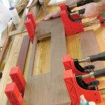 I glued in the backing blocks with spring clamps. One clamp pressed the block to the apron; the other clamp pulled the block against the leg. Here I’m removing the clamps after the glue has dried. With the clamps off, mark the final shape of the apron on the inside as shown.