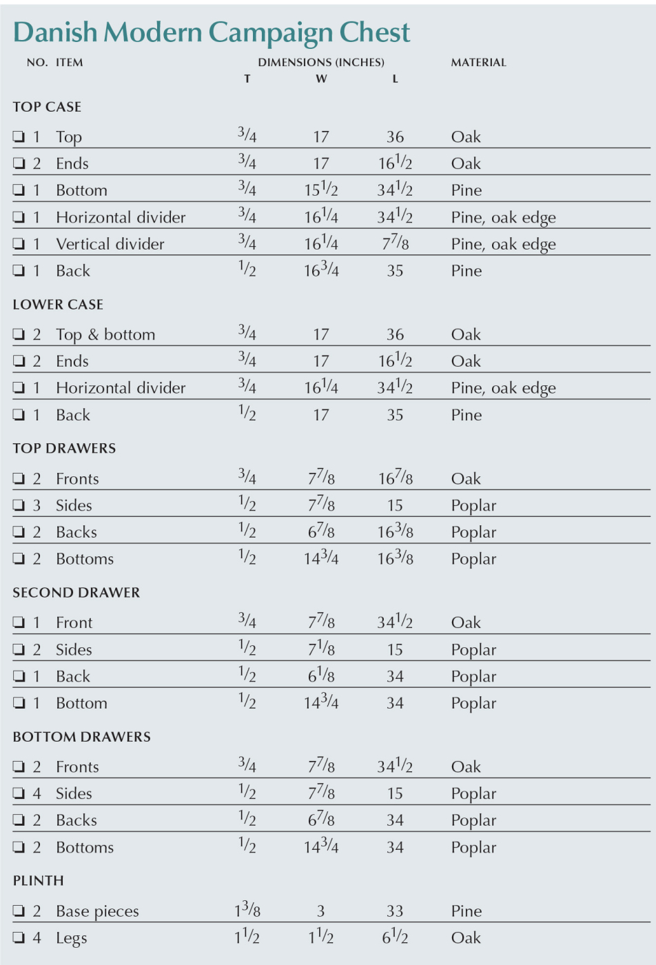 Like most campaign chests, all the pulls and lifts are flush to the carcase, though in this case they are cutouts backed with darkened brass. Also like campaign chests, the entire thing breaks apart to be moved easily to a new apartment (or tent in the desert). But unlike 19th-century campaign furniture, this chest embraces contemporary joinery to make the chest a cinch to build.
