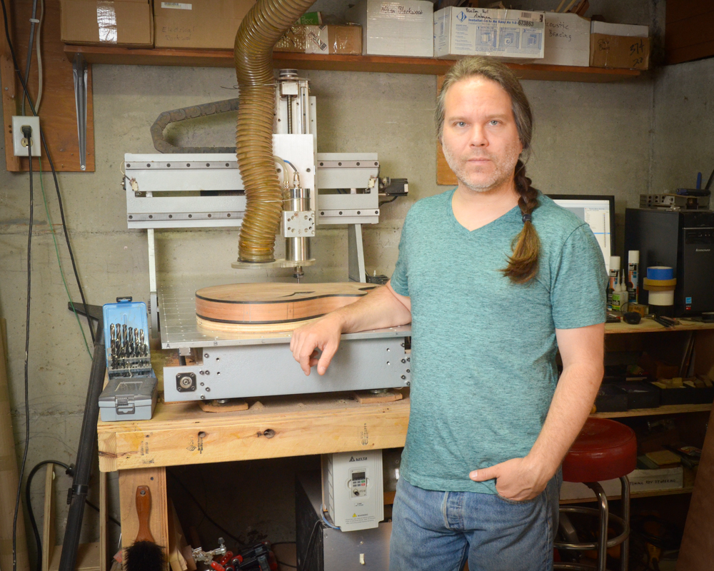 This post is about Seattle area guitar maker, David Myka. David is a long time guitar maker who’s skilled in the many woodworking processes need to create acoustic and electric instruments. His instruments are far from being off the rack. Each is very much a custom build. Every guitar is created to fit individual requirements including special electronics, inlays and custom necks and fretboards and guitar body shapes. He is most famous for his incredible custom archtop electric guitars. David is a long time CAD user and has a CNC in his shop to help him in his work for a number of years. Here’s a quick interview with David in his shop…
