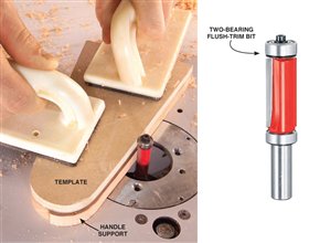 | Align the handle support’s template with the bracket’s centerline and flush with the box’s bottom. Butt two guide boards to the template. Fasten the boards to the brackets. |