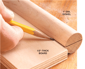 | Mark centerlines on both ends of the box’s handle, a large dowel. Guide the pencil with a board whose thickness is half the dowel’s diameter. Saw the line to make a kerf that will receive wedges. |