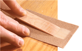 | Sand the box’s edges on a flat surface to make them flush. Use double-faced tape to hold the sandpaper. When the sides are flush, glue on a slightly oversize plywood bottom. |