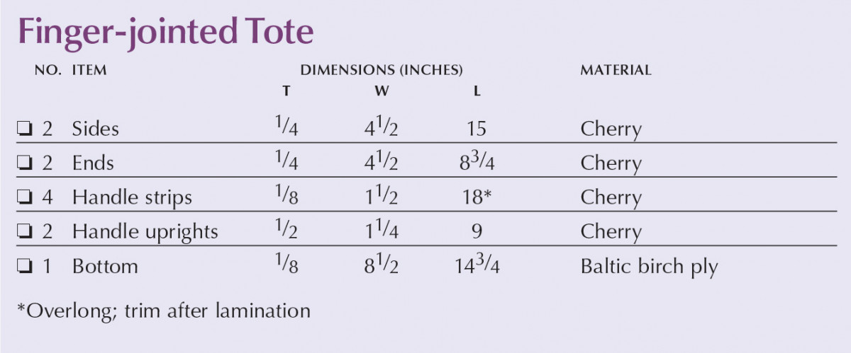 But this quilting tote has many of the same elements, including a curved handle, narrower in the center for a comfortable grip and wider at the ends for sliding-dovetail joinery. I decided on bent lamination to add strength to the thin, curved handle.