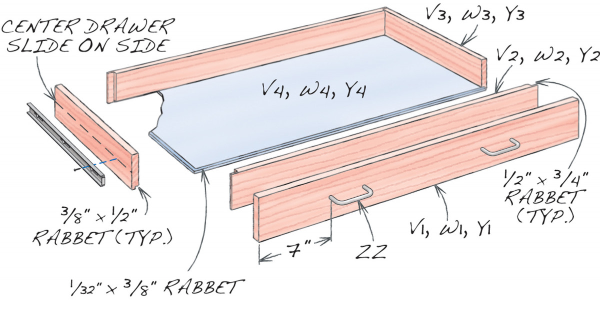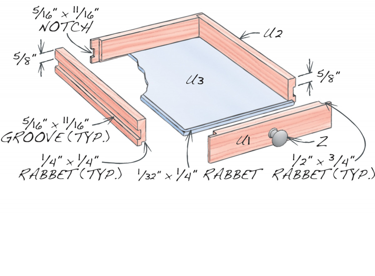 12. Glue and nail together the drawer boxes. Then rout rabbets and install the drawer bottoms (U3, V4, W4, Y4) and shelf (X4). Create effective gluing surfaces on the melamine bottoms by routing shallow rabbets around the edges.