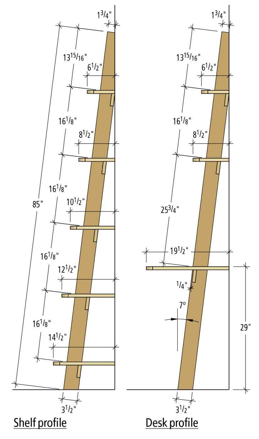 After numerous experiments and revisions, I discovered that these shelves actually are more of an engineering equation than a woodworking project. The leaning angle and the height of the units work together to determine the depth of the shelves. Getting these factors to work together to produce sensible shelving is trickier than it first appears. So take care if you want to modify this design – small alterations make big differences.
