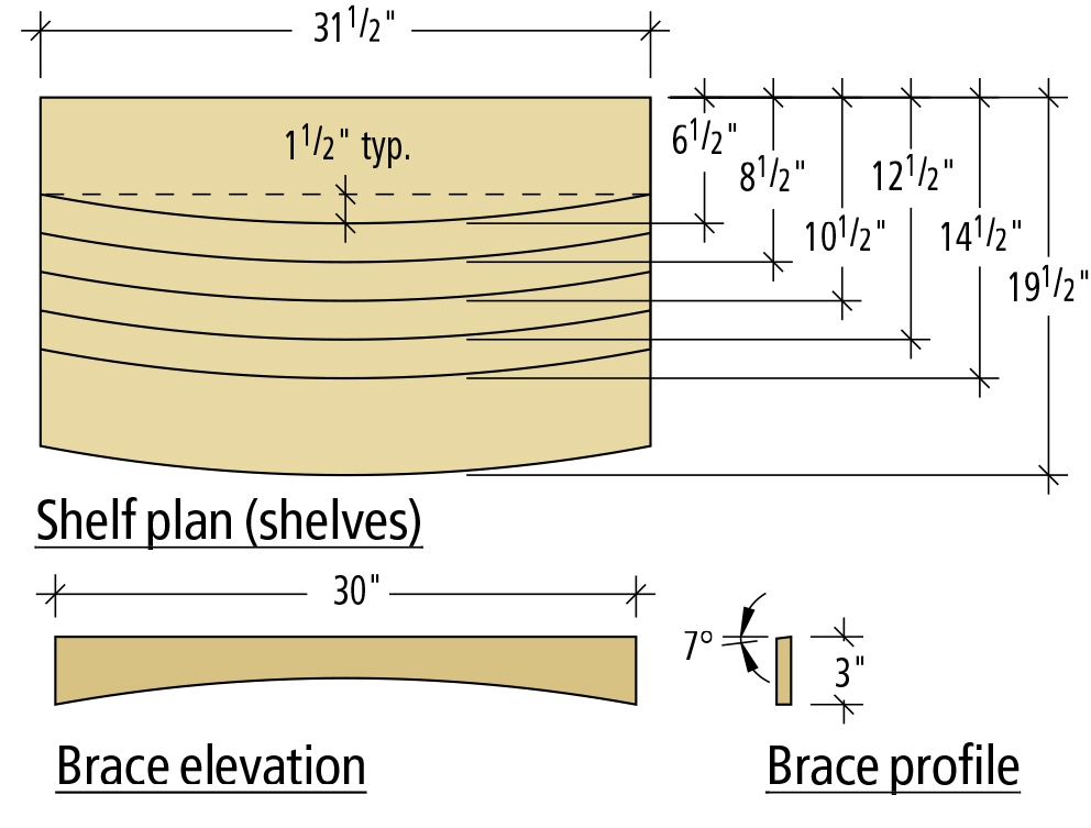If you’re going to add a curve to your braces and shelves, you should make two routing templates to ensure the curves are consistent – one template is for the shelves and the other template is for the braces.