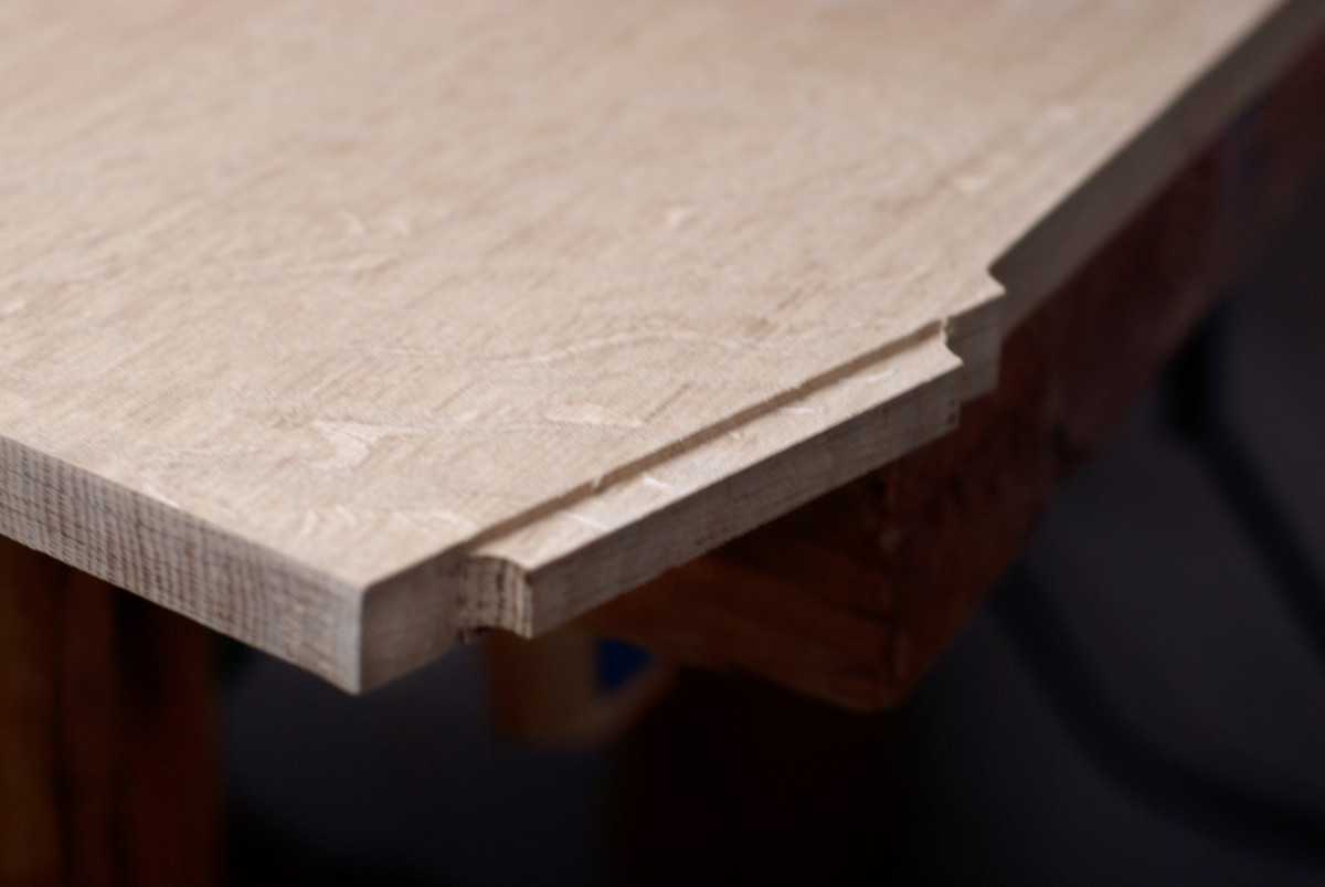 If you have access to wide stock, you may be able to cut the top and shelf from single boards. I had to glue up both, slip-matching a single board for each part, then turning my attention to pattern making.