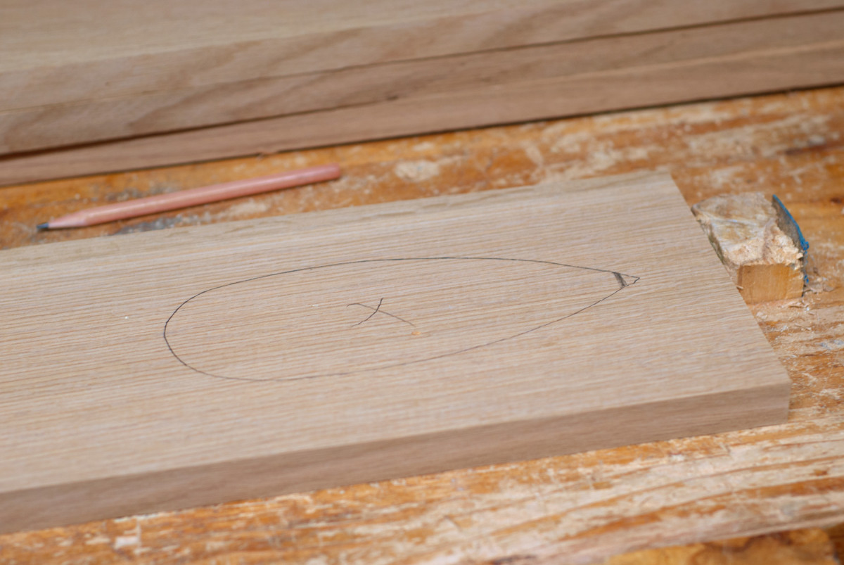 Mark the spots. The leg pattern serves a double purpose: it shapes the cutout and provides a template to trace the cutout for the carved leaves.