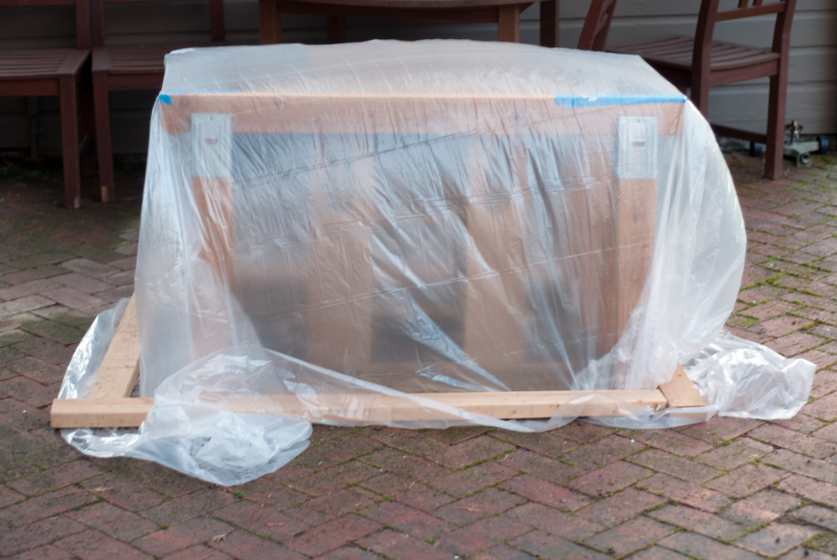 Fume it. The table is fumed for 48 hours in a tent made from sawhorses and plastic sheeting.
