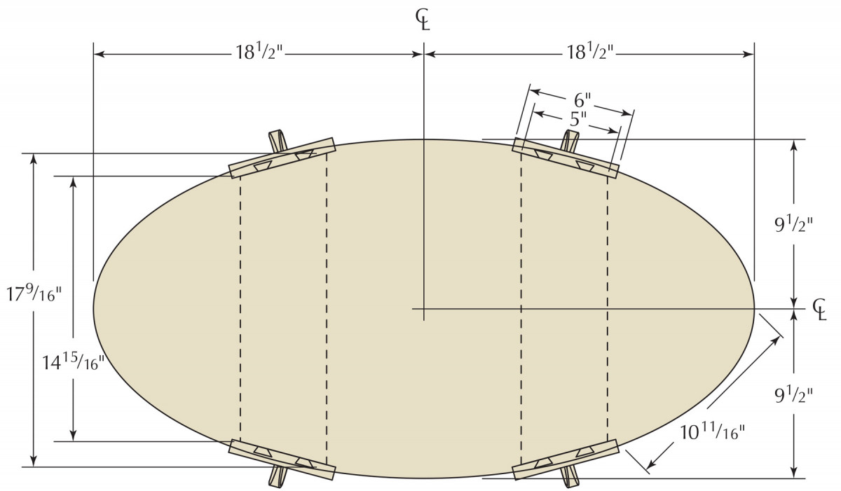 Like the shelf, the top is pattern routed to final shape by positioning and flipping the pattern. Mark horizontal and vertical centerlines on the bottom face of the top, then trace the ellipse.