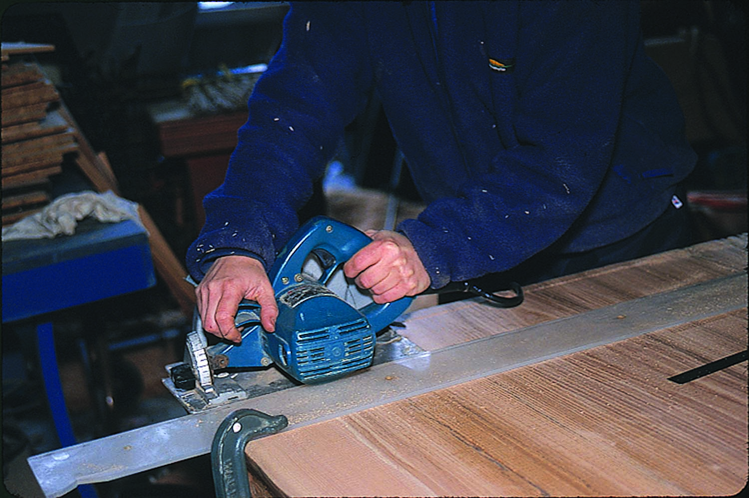 A quick trip to flat. A power planer is used to flatten the tabletop, the first pass is run across the grain.