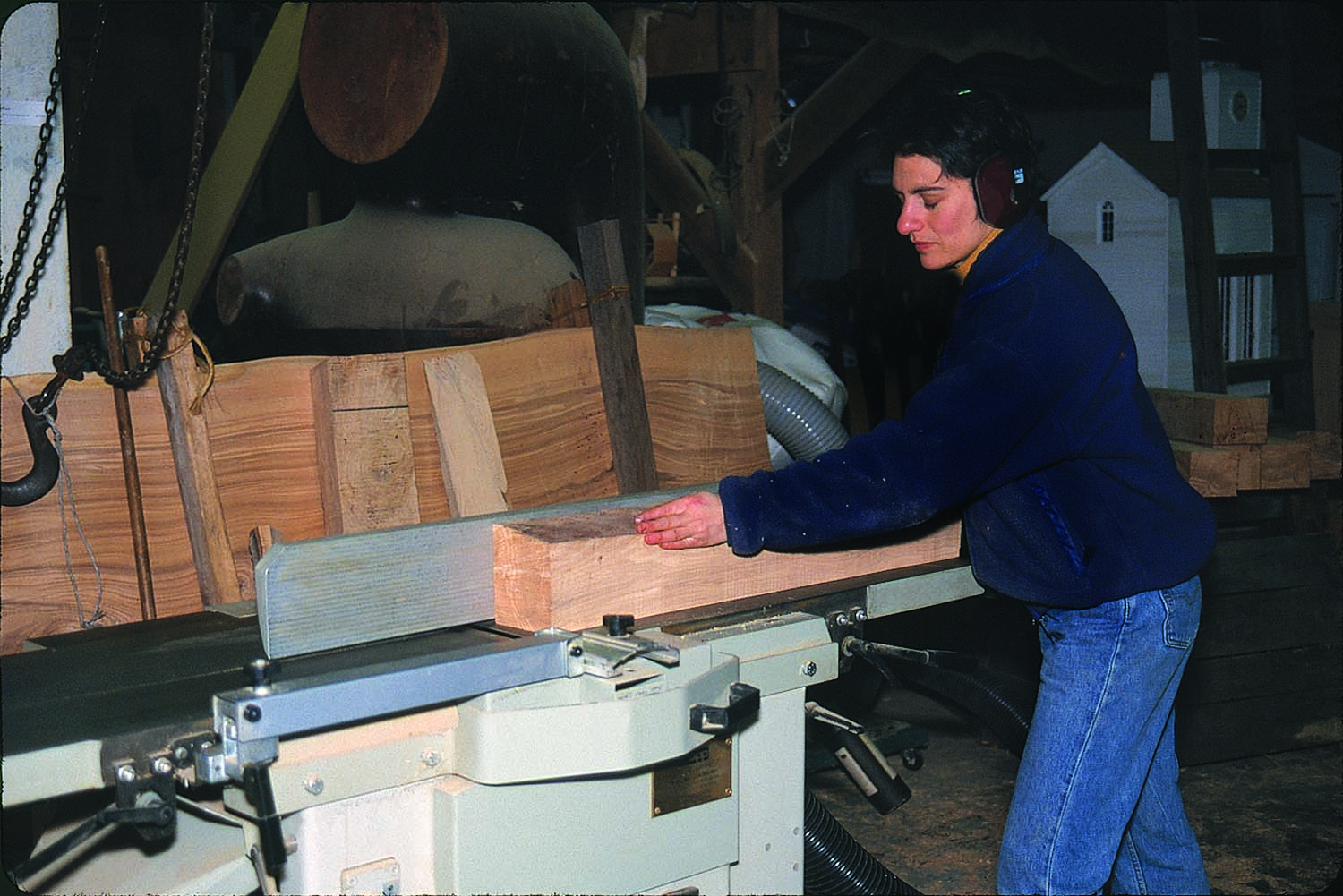It’s not all handwork. A jointer squares the sides of the beams and legs before sizing them with the band saw with a 2″-wide blade.
