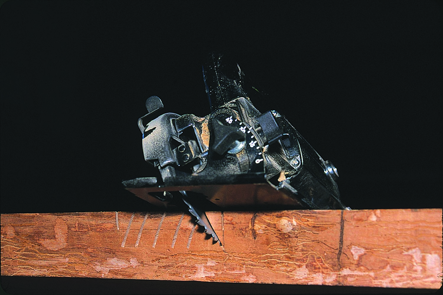 Machined breakthrough. Roughly drilling mortises into the beam, halfway through from both sides, opens the slots with ease. Use a chisel to accurately clean the mortise for final fitting.