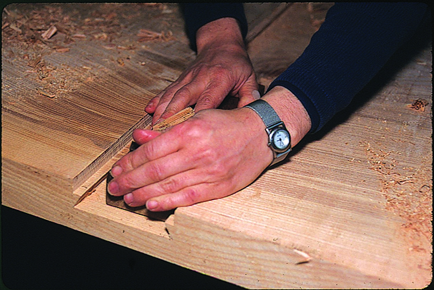 We decided on the tail’s angle, and the size and depth of the tail support, before she marked out the lines. Laure used a circular saw, chisels and a narrow Japanese plane to remove the waste. She checked flatness with a straightedge to produce the tapered sliding-dovetail groove.