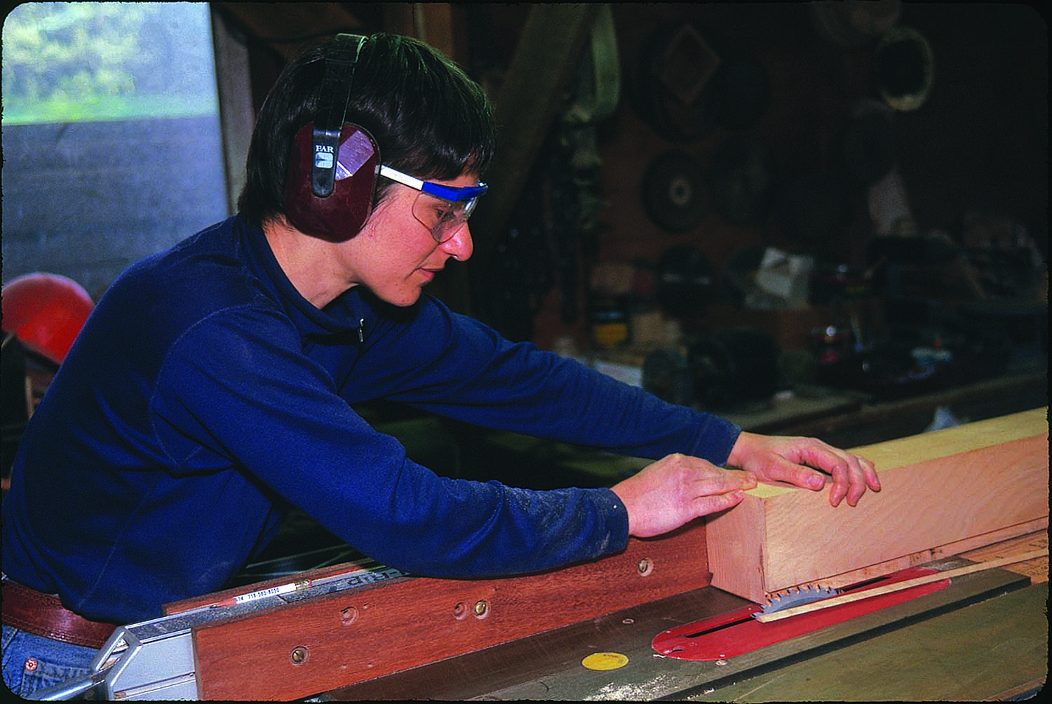Next, she marked the beam’s tapered sliding dovetail with a marking gauge and knife, and used the table saw to roughly notch out the tail.