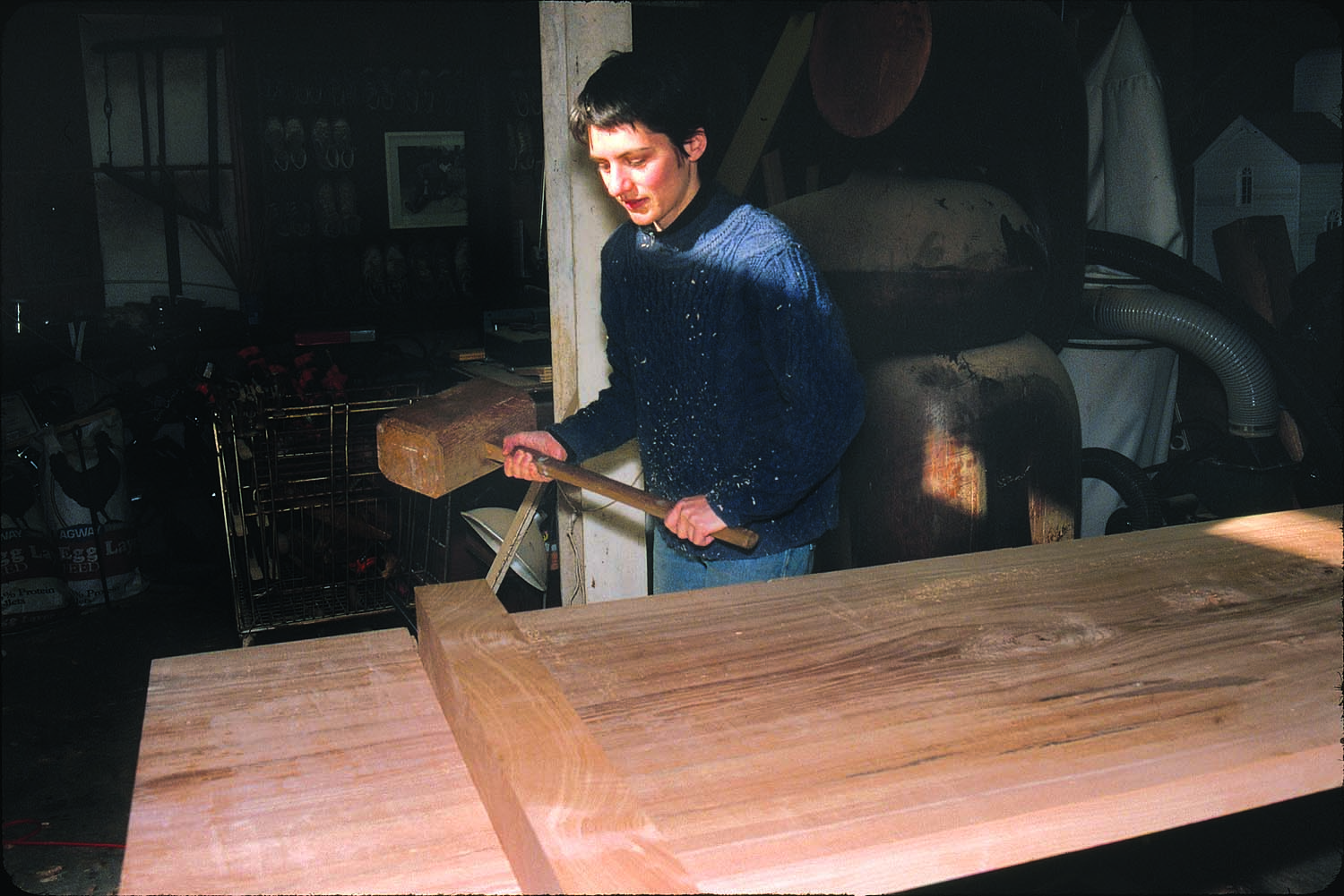 One more time. The beams, with the legs attached, are again pounded into the tabletop. The beam’s ends are then cut flush with the edge of the slab.