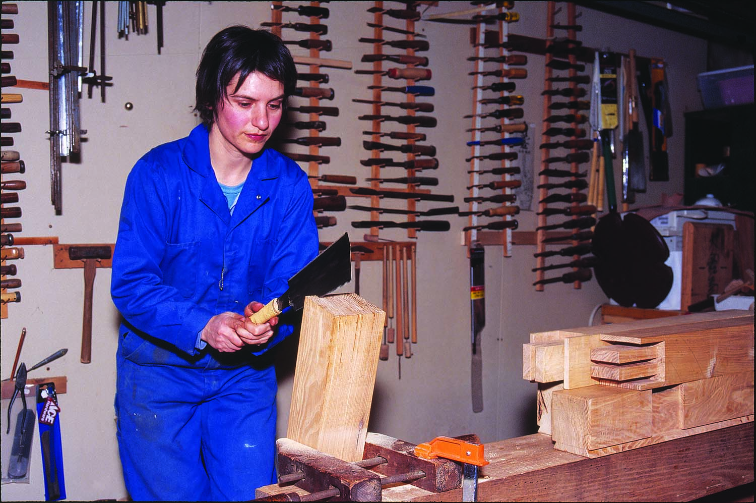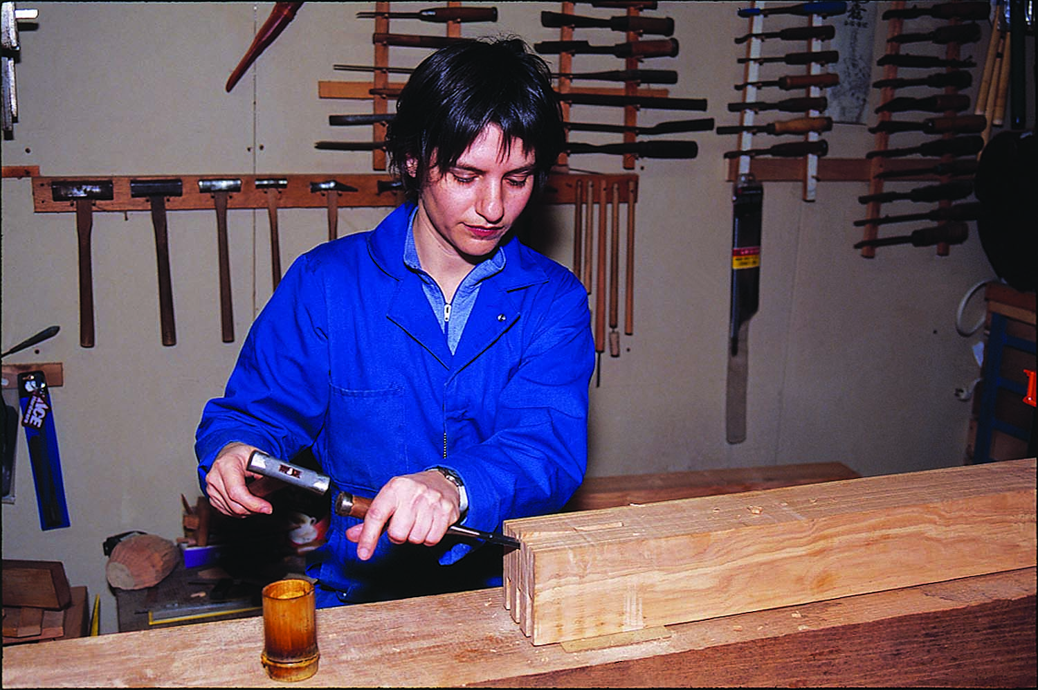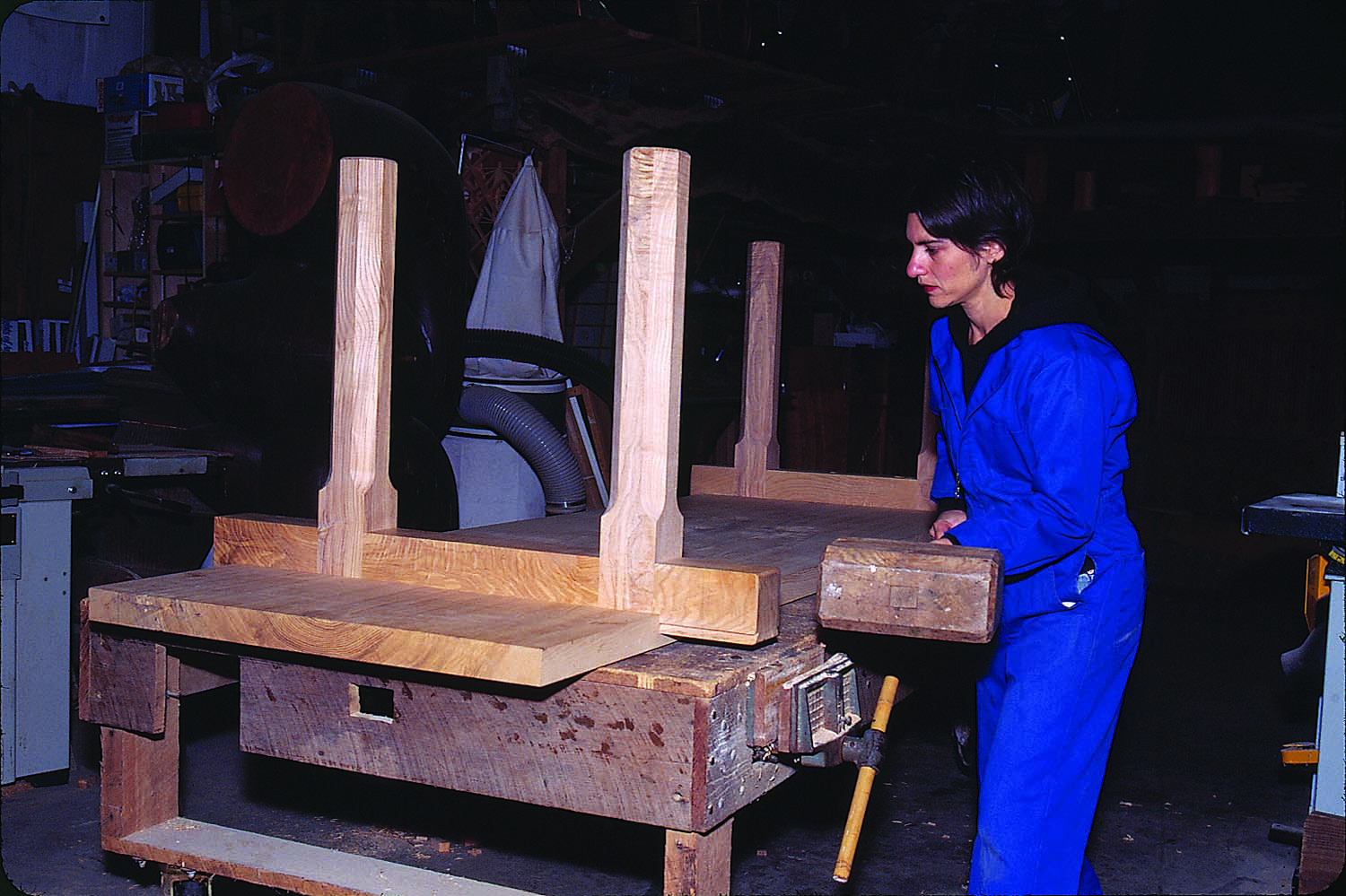 Laure cut the end of the legs cleanly and squarely, then marked for the tenons. Next, she ripped the legs’ tenons with a Japanese hand-held ripsaw and removed the material between using chisels.
